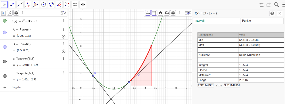 - Mit der Maus Punkte auf der Kurve markieren oder Tangenten einzeichnen, um Eigenschaften zu erkunden