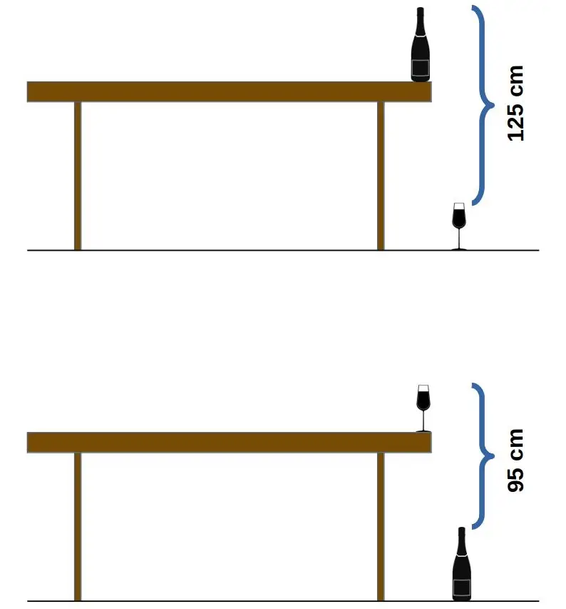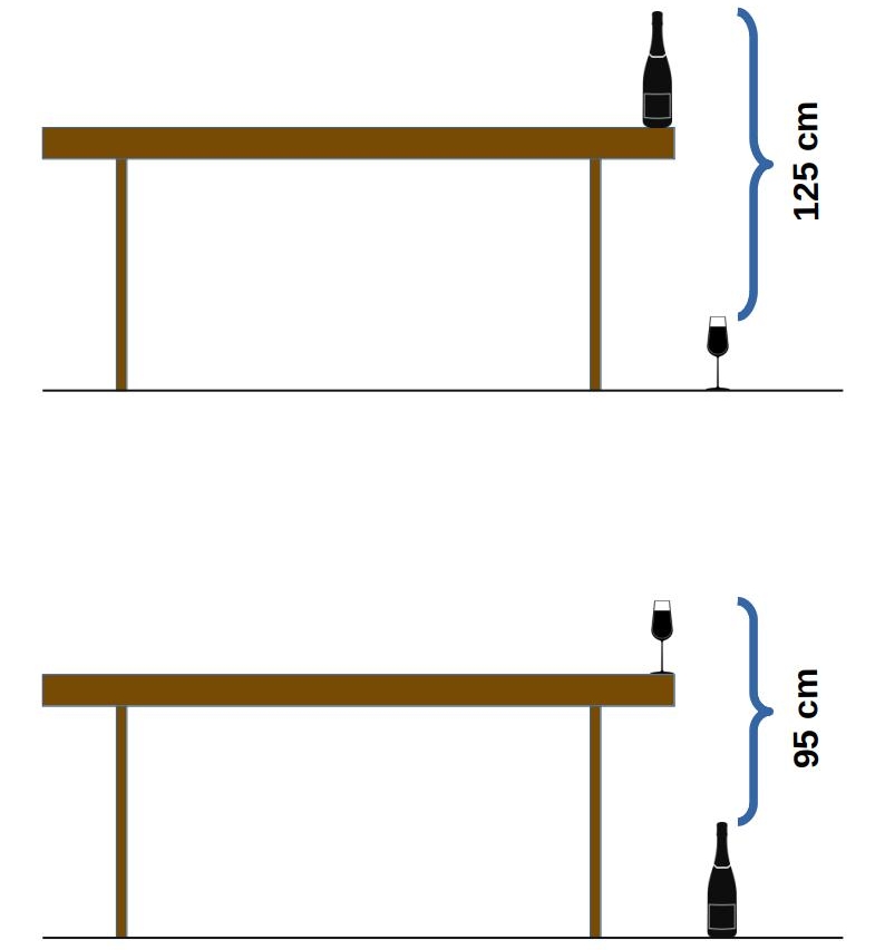 Auf einem Tisch steht eine Flasche. Auf dem Boden liegt ein Glas. Der Abstand vom oberen Rand des Glases bis zum oberen Rand der Flasche beträgt exakt 125 cm.